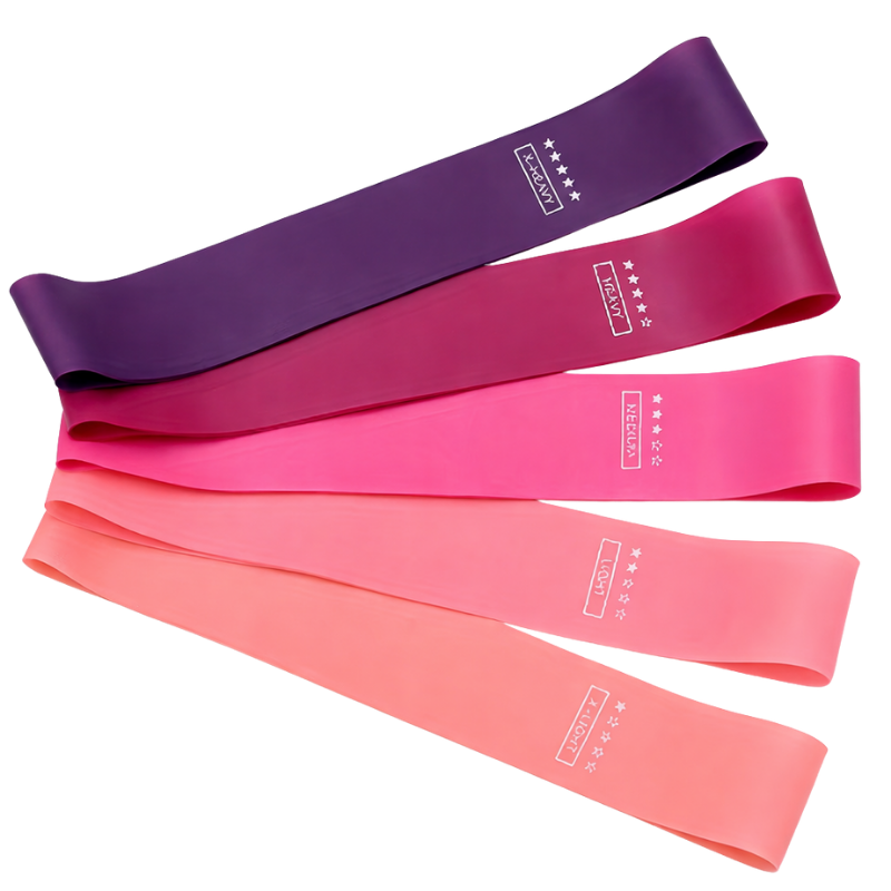 Комплект от 5 еластични ластици за тренировка, подходящи за йога, пилатес и стречинг. Различните нива на съпротивление позволяват упражнения за крака, бедра, седалище и цяло тяло.